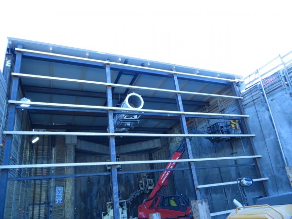 As the site is located it the urban city area, the excavation pit in the direct portal area had to be covered prior to the excavation works start. This temporary overhead cover consists of steel H-beams, wooden timbers and sandwich panels. The aim is noise reduction for the residents in the period of tunnel excavation, especially at nights.